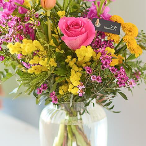 A handblown vase filled with vibrant spring-inspired flowers, expertly arranged by a local florist.