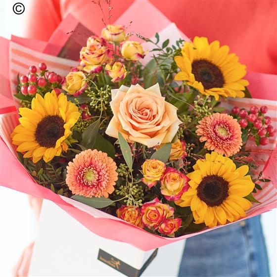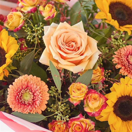 Summer might be on it's way out, but that doesn't mean skipping the sunshine. This gorgeous bouquet brings the warmth with blooms in rich vibrant colours plus at least three radiant sunflowers.