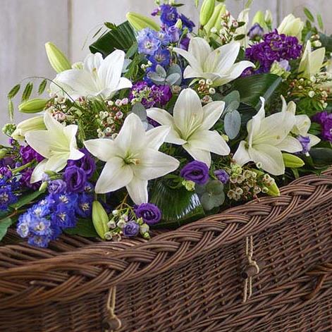 A beautiful array of blue, purple and white blooms including delphiniums, lilies and stocks.