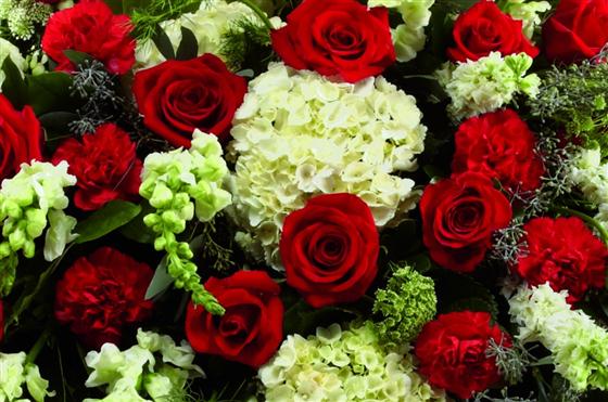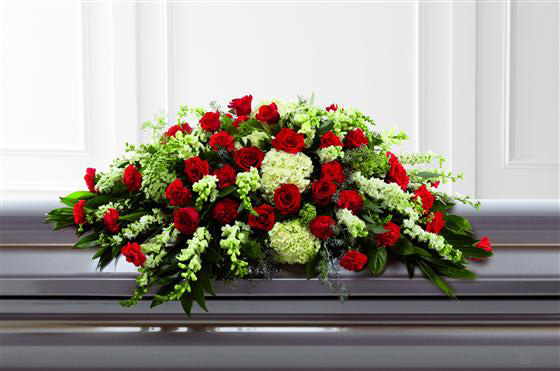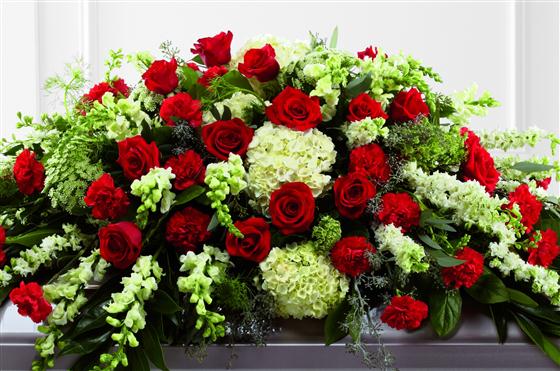 Rich red Rose and carnations are an eye-catching addition to a bed of white hydrangea, larkspur, antirrhinum, Queen Anne's lace and choice foliage to create a beautiful casket spray.
