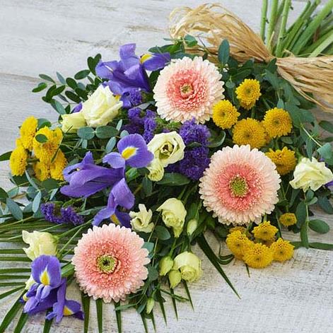 A delicate array of yellow, blues and peach featuring irises, chrysanthemums and germini.
