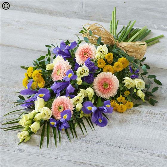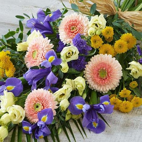 A delicate array of yellow, blues and peach featuring irises, chrysanthemums and germini.