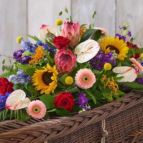Tropical blooms in vibrant shades, including protea and anthurium, meet lush foliage and sunflowers in this beautiful casket spray.