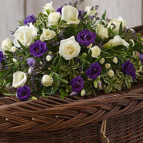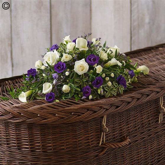 Elegant blooms, including roses, lisianthus and calla lilies, contrasted with lush foliages in this small casket spray.