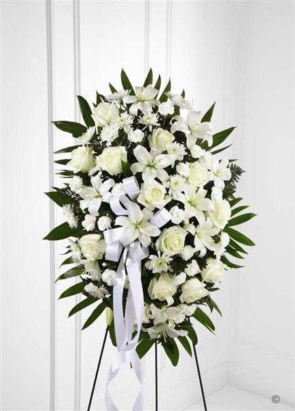 This exquisite standing spray in white and green includes roses, Asiatic Lily, spray chrysanthemums and spray carnations arranged amongst palm fronds and lush greens. Accented by white satin ribbon and standing on a wire easel, this standing spray will make a truly beautiful addition to the service.