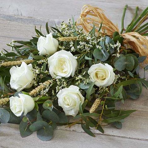Gorgeous roses and eucalyptus beautifully combined with natural elements including dried wheat and a raffia bow.