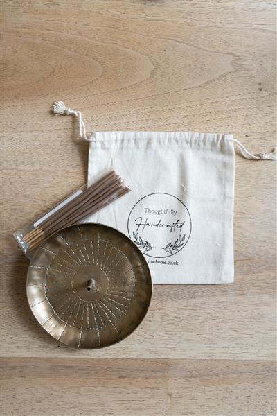 Our forged brass incense burner makes a beautiful addition to the collection. The etched detail adds extra interest to the piece. Comes complete with incense sticks in a cotton presentation bag